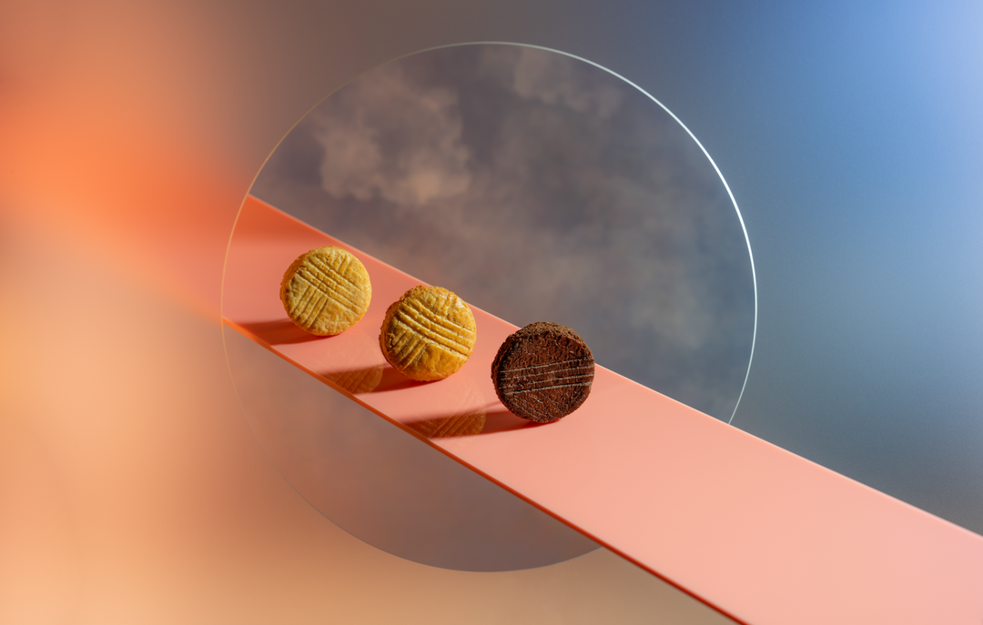 透過完美比例烤培後,伴隨酥餅與發酵奶油融合於口中的絕佳滋味。共2款口味:蛋黃*2、可可*3。