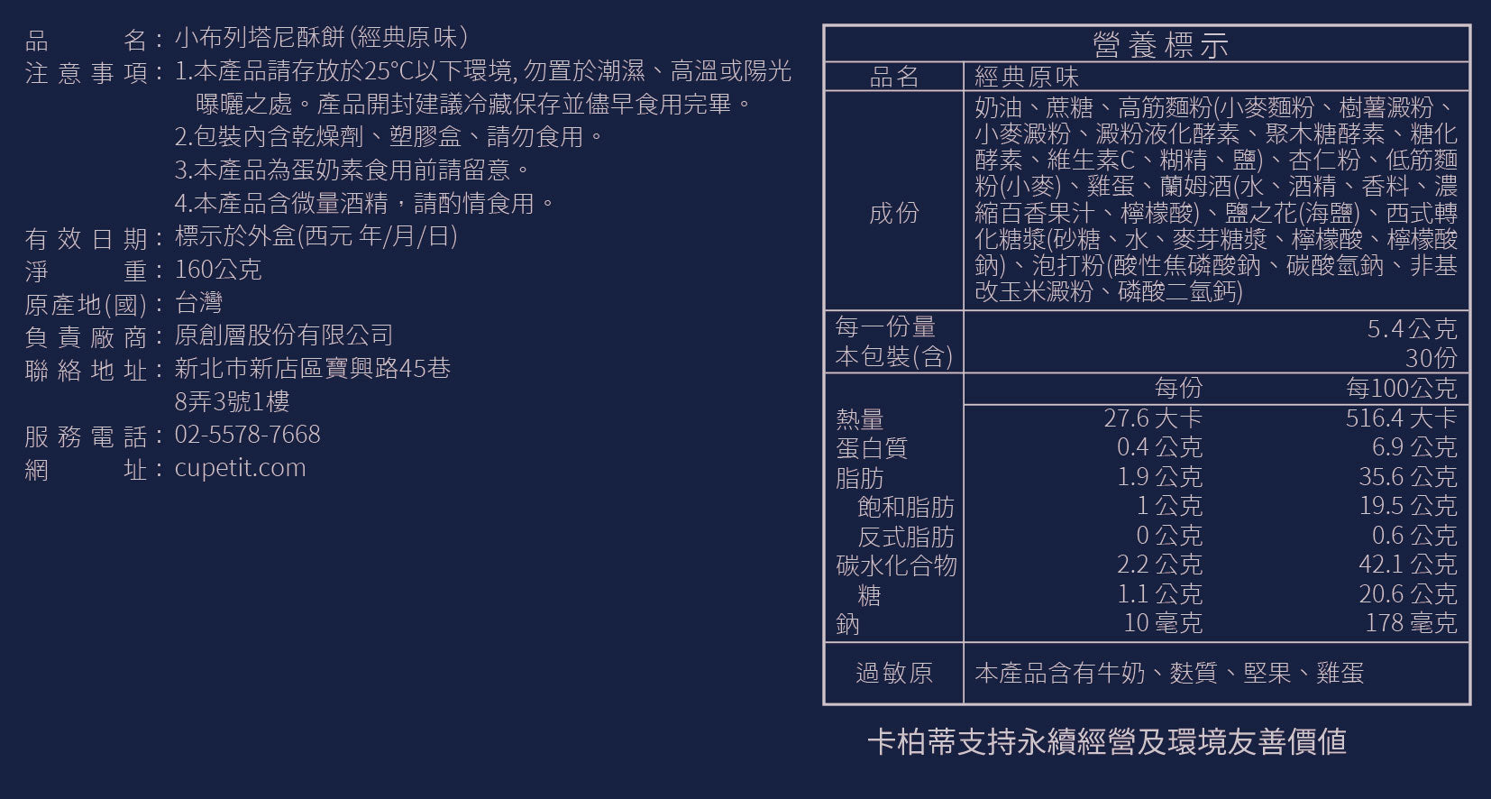【經典原味】小布列塔尼酥餅30入小鐵盒 內容: 小經典原味布列塔尼酥餅 30入 禮盒尺寸:L10*W14.5*D5.9 cm 提袋尺寸:L22*W24*D12 cm 商品賞味期&保存方式: 全品項請存放於25°C以下環境; 賞味期 : 點心30天。 品項為蛋奶素(含微量酒精,請酌情食用)。